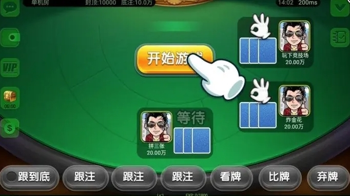 比牌:拿自己的牌与游戏中玩家的牌比大小,两人以上玩家游戏时比牌可以选择对手。最大按钮:将预投入在游戏中的最大投入额,再点加注按钮后将投入最大额。